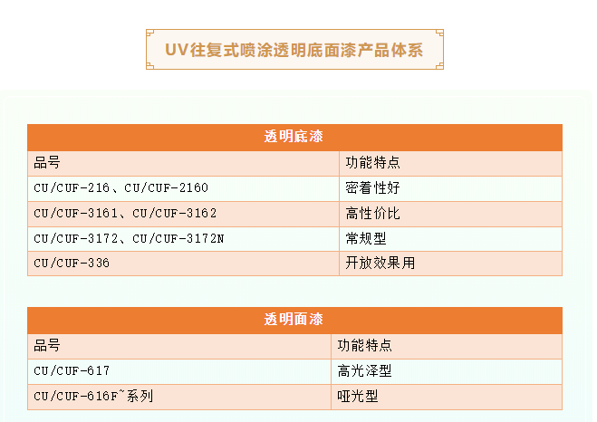 素材→UV往復(fù)式噴涂開放底漆(50-60g/㎡)→UV固化→輕砂→UV往復(fù)式噴涂透明底漆(60-80g/㎡)→UV固化→砂光→UV往復(fù)式噴涂透明面漆(60-80g/㎡)→UV固化
