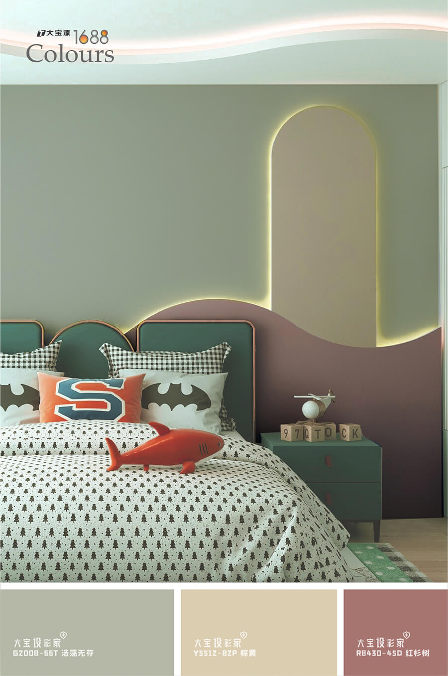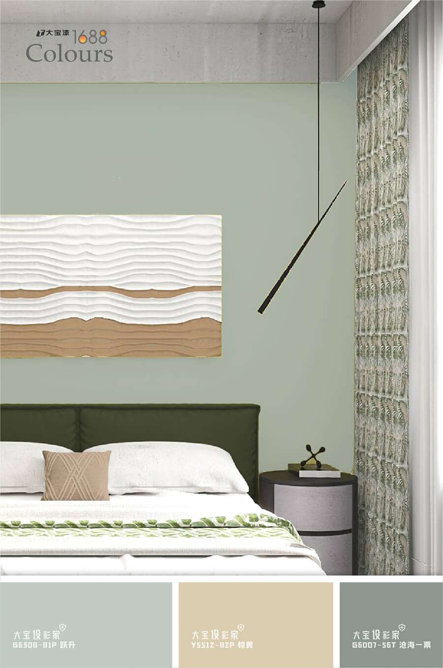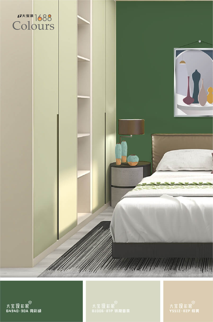 灰綠的莫蘭迪色在空間中百搭零失誤,運用在臥室空間會更舒服穩(wěn)重,大寶荷采綠(G4940-30A)賞心悅目的顏色,富有治愈氣息,可以作為大量的墻面色彩使用,也可以用櫥柜、茶幾、床組等軟裝作為色彩載體進(jìn)行局部性點綴,不僅可以點亮空間,還能帶來清爽自由。