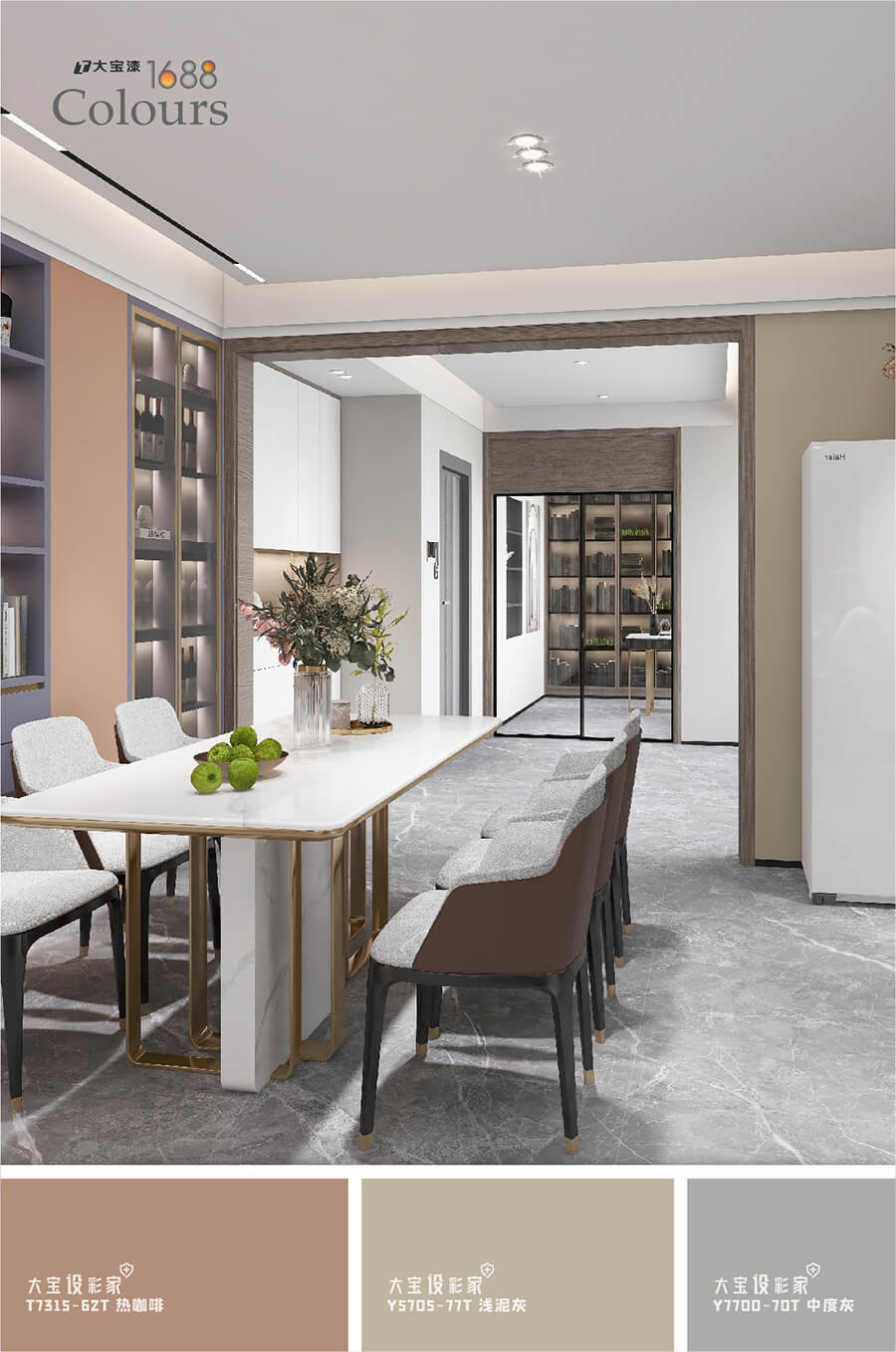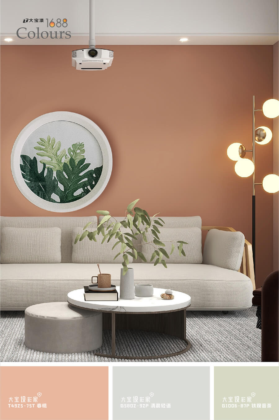 低飽和的色調(diào)度,將家居空間中大面積填鋪,大寶春桃橘(T4925-75T)的與眾不同,在于濃而不烈,剛?cè)嵯酀?jì),與霧霾灰沙發(fā)、大理石紋茶幾、金屬燈飾等材質(zhì)搭配起來,達(dá)到冷暖色系之間的平衡,利用大寶涂料,創(chuàng)造出有靈魂的空間。