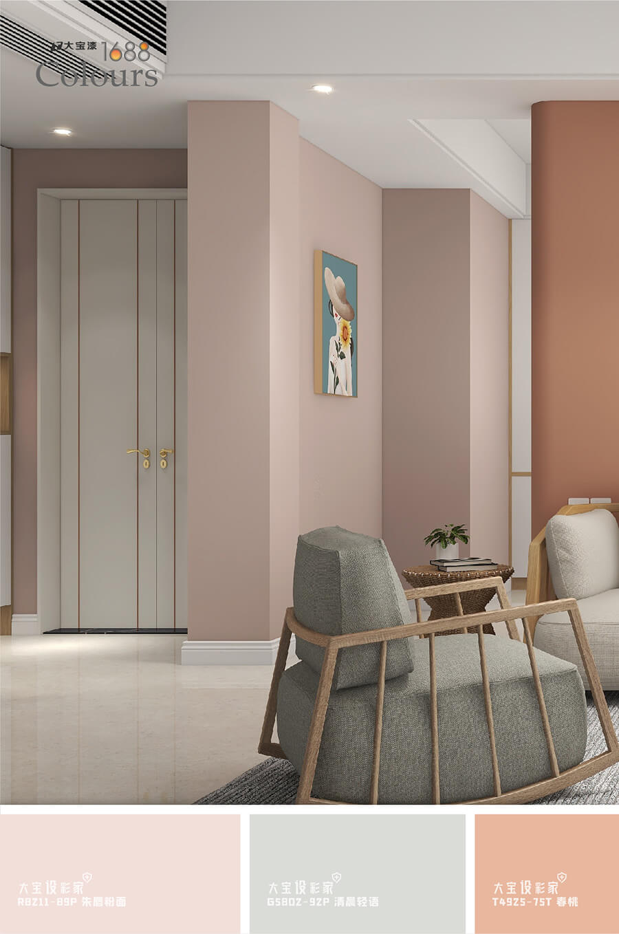 如果溫柔有顏色,那一定是莫蘭迪粉灰色(大寶R8211-89P)的暖甜。低彩度、明度的粉色,跳脫出亮粉色的鮮艷甜膩,傳遞出一種成熟優(yōu)雅的韻味,從墻面到家具,搭配利落的線條和親和力十足的木質(zhì)家具做點綴,讓空間保留著輕柔靜謐的氣度,極致的柔和魅力塑造起高級且質(zhì)感的居家空間~