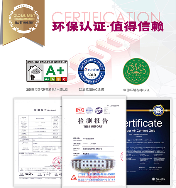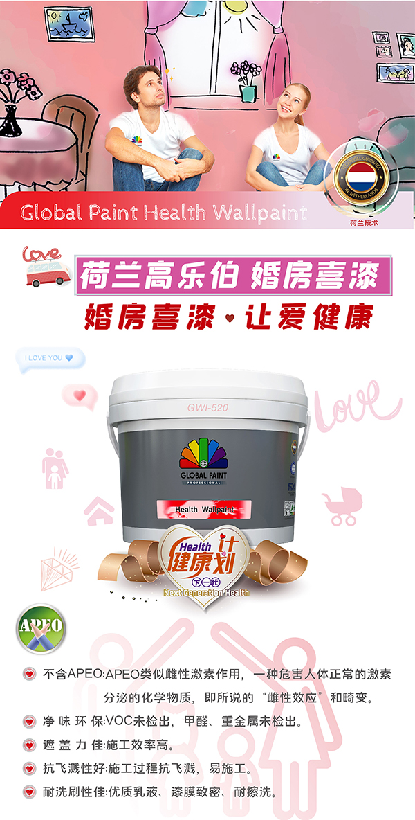 高樂伯婚房喜漆采用先進的環(huán)保科技乳液配方,嚴選優(yōu)質(zhì)原材料,不含APEO(壬基酚聚氧乙烯醚,這是一種已被證實會影響動物和人體生殖系統(tǒng)的助劑)。為愛妻人士提供一款全方位的婚房用愛漆,特別適合新婚家庭,打造一個安全無憂的居住環(huán)境,為孕婦和小寶貝的健康保駕護航。