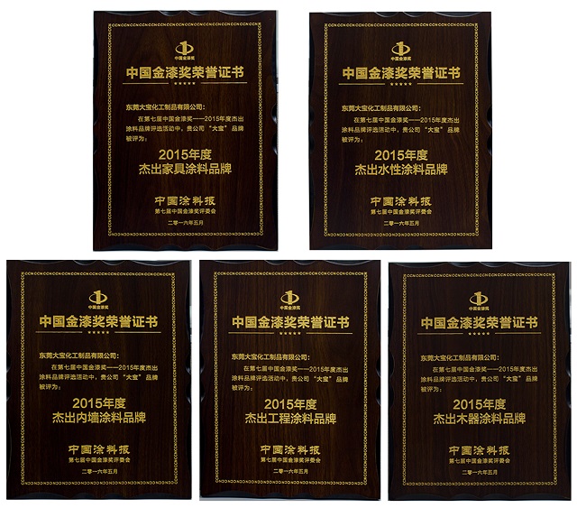 大寶漆憑借著過(guò)硬的產(chǎn)品質(zhì)量及強(qiáng)大的銷(xiāo)售業(yè)績(jī),獲得了廣大消費(fèi)者的認(rèn)可,一舉獲得了“2015年度內(nèi)墻涂料杰出品牌”、“2015年度木器涂料杰出品牌”、“2015年度工程涂料杰出品牌”、“2015年度家具涂料杰出品牌”、“2015年度水性涂料杰出品牌”等五項(xiàng)大獎(jiǎng);