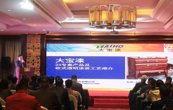 隨后,大寶漆經銷事業部高顯峰課長、張珈銘專員、胡平平課長、鄧偉利專員分別對“三三專案”歐式涂裝、UV木器漆、水性木器漆及寶宮石相關產品內容向大會作報告,其中胡平平課長所作“漆時代‘水’做主”的主題演講成為本次研討會的重點與亮點內容。
