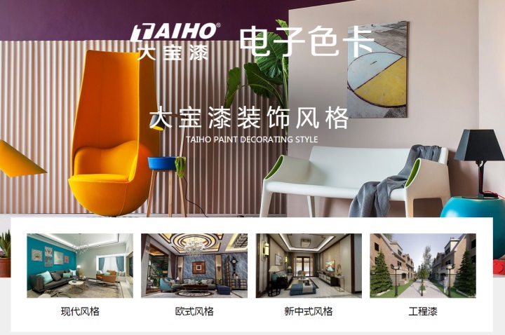 大寶漆在線配色電子色卡體驗系統,主頁風格模塊包括現代風格、歐式風格、新中式風格、工程漆,在這里你可以根據居家戶型、裝修風格、個人喜好選擇色彩、產品,隨心組合搭配,就能立即看見“實裝效果”,全方位滿足消費者不同程度的色彩和涂裝服務需求。