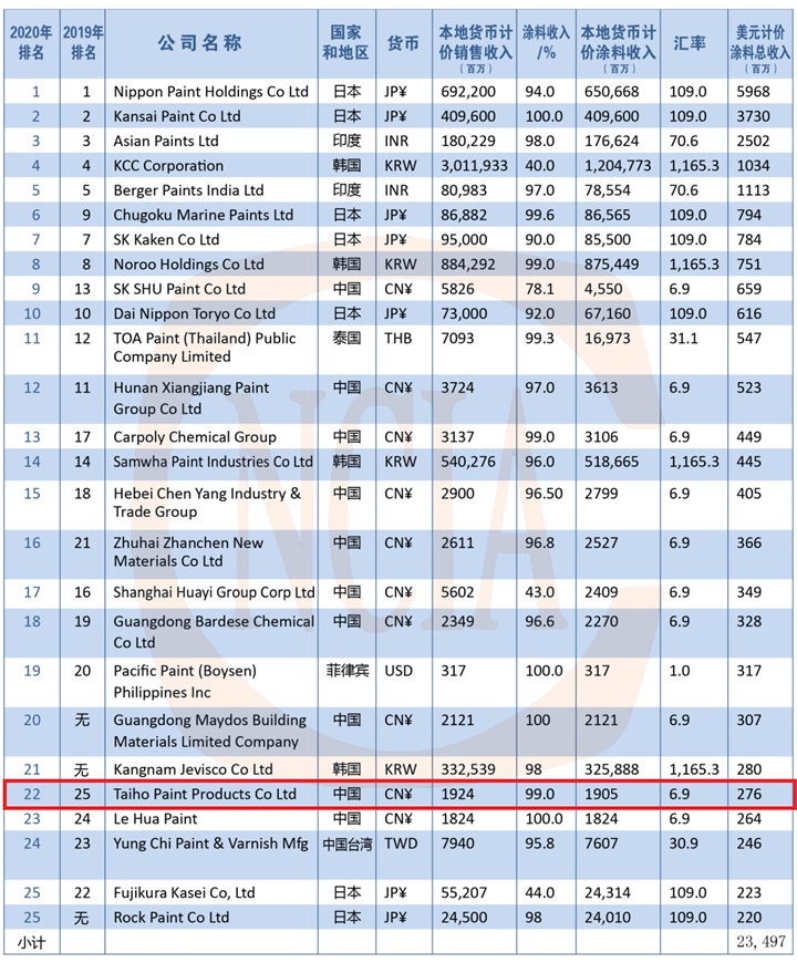 2020亞太地區(qū)涂料生產(chǎn)商TOP 25榜單