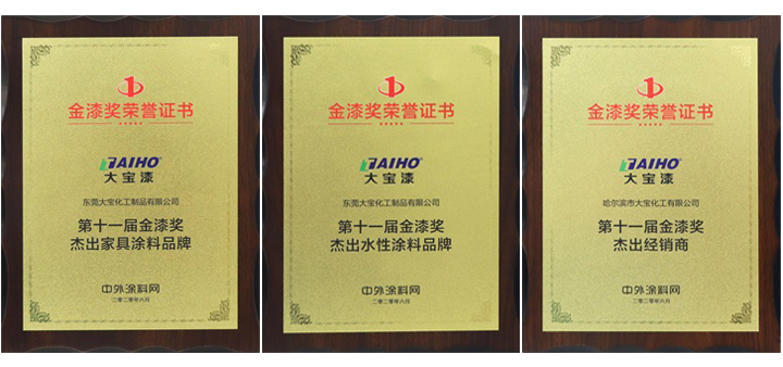 會上還揭曉了“第十一屆金漆獎”評選結果并舉行了金漆獎頒獎盛典。大寶漆再次以強大的品牌價值和影響力,得到行業的認可,一舉斬獲3項重量級榮譽,分別是“杰出家具涂料品牌”、“杰出水性涂料品牌”等獎項。同時,大寶漆哈爾濱經銷商哈爾濱大寶獲得“杰出經銷商”的榮譽。