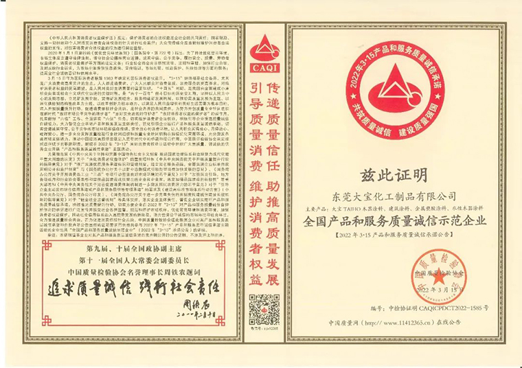 榮譽(yù),是對(duì)大寶漆的肯定,更是推動(dòng)大寶漆不斷向前發(fā)展的動(dòng)力!未來,大寶漆仍將不忘初心,始終專注于高品質(zhì)涂料的研發(fā)推廣,積極恪守質(zhì)量誠信,踐行社會(huì)責(zé)任,以微薄之力助推國家“質(zhì)量強(qiáng)國”建設(shè)。