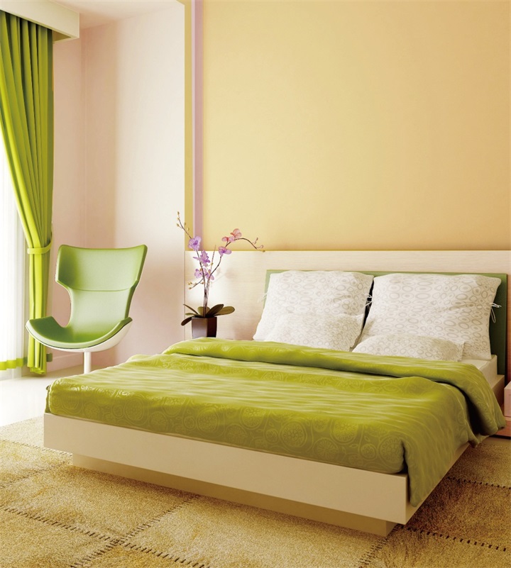 煙波藍(lán)與珍珠粉的淺色系墻面配色運(yùn)用,使空間變得水嫩活潑。配以鮮綠色和橙黃色的家具作為點(diǎn)綴,則具有畫龍點(diǎn)睛的效果。