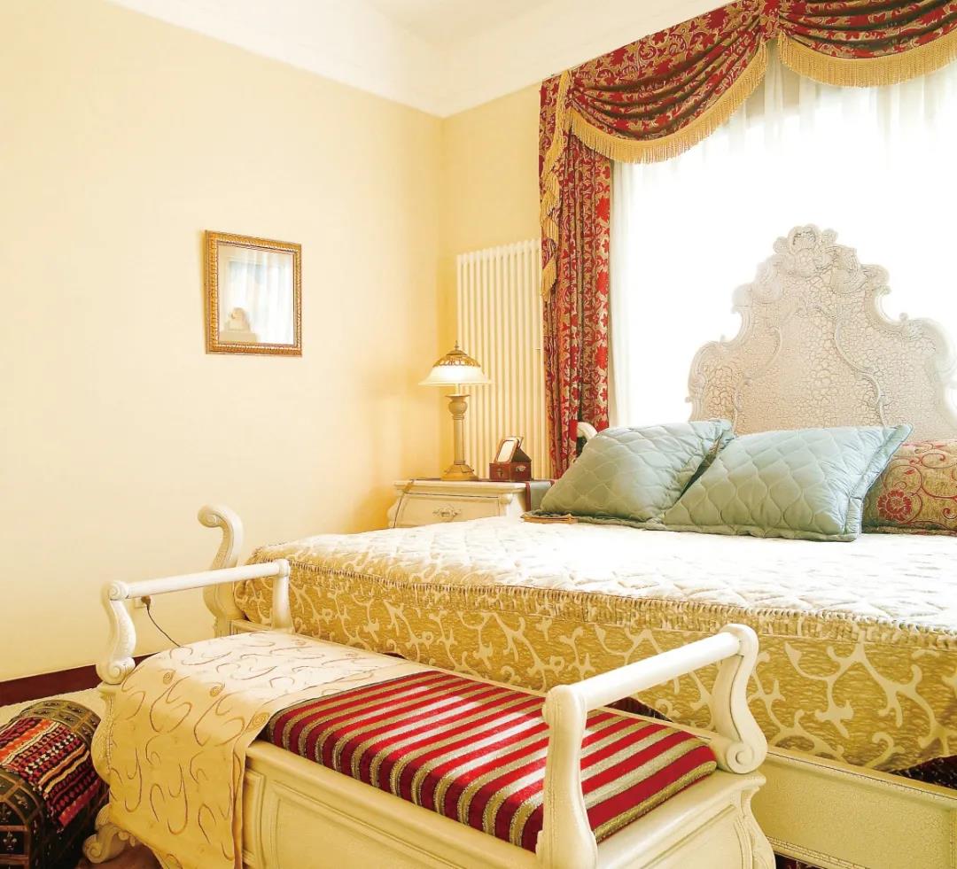 臥室統(tǒng)一采用暖色調(diào)的配色,墻面大面積使用淺駝色,搭配純度較高的紅色窗簾和床飾進(jìn)行點(diǎn)綴,給人低調(diào)奢華的居家感受。