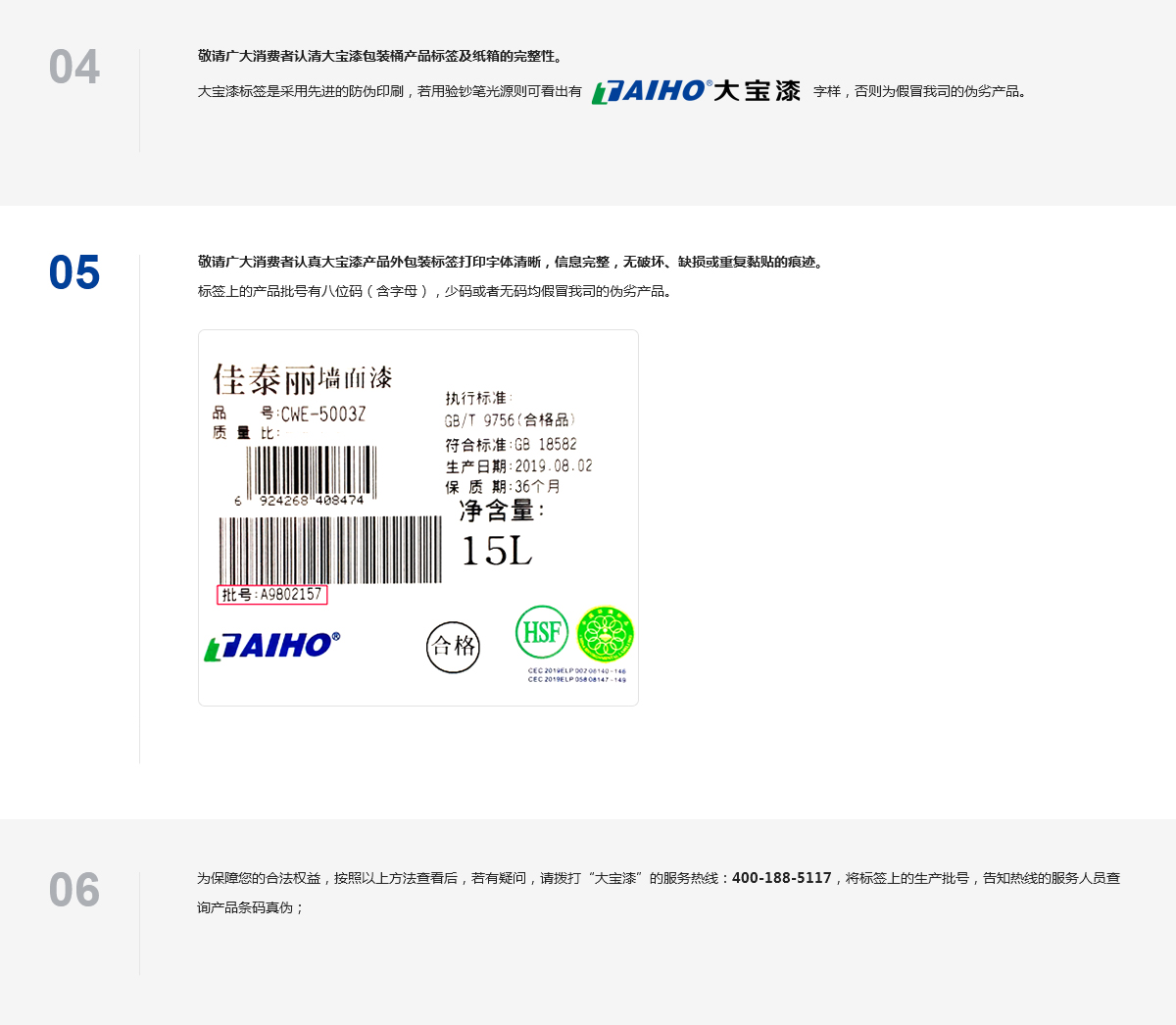 為保障您的合法權益,按照以上方法查看后,若有疑問,請撥打“大寶漆”的服務熱線: